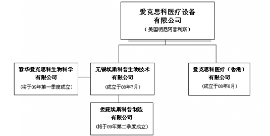 爱克思科医疗设备有限公司成立于1995年11月22日,是一家总部位于美国,并在美国明尼苏达州注册成立的公司 公司拥有一家座落于中国江苏省无锡市的外商独资控股公司,和一家位于香港的外商独资子公司 公司还计划在山东省淄博市成立一家合资公司,即新华爱克思科生物科学有限公司,并拟于湖南省娄底市成立一间制造基地,即娄底埃斯科普制造有限公司