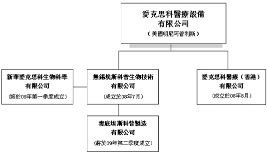 愛克思科醫療設備有限公司成立於1995年11月22日,是一家總部位於美國,並在美國明尼蘇達州註冊成立的公司 公司擁有一家座落於中國江蘇省無錫市的外商獨資控股公司,和一家位於香港的外商獨資子公司 公司還計畫在山東省淄博市成立一家合資公司,即新華愛克思科生物科學有限公司,並擬於湖南省婁底市成立一間製造基地,即婁底埃斯科普製造有限公司